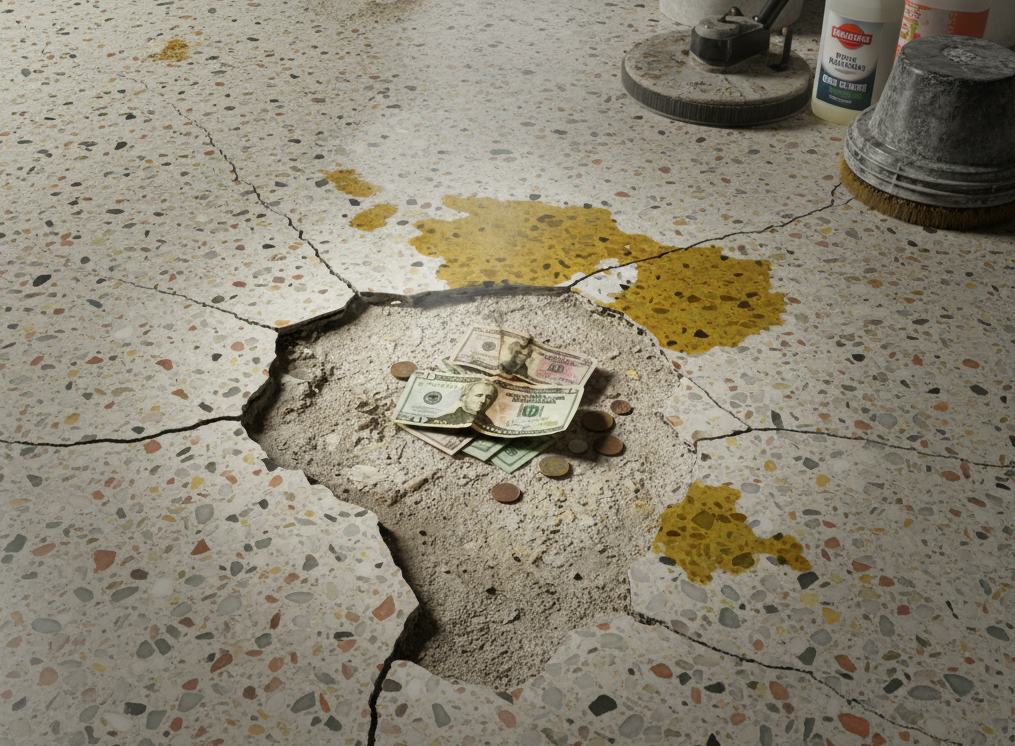 Zaoszczędzisz na początku, wybierając standardowe mineralne terrazzo, ale z czasem zapłacisz więcej — pęka, chłonie plamy, wymaga ciągłej renowacji i ma nieestetyczne dylatacje, które psują wygląd posadzki.